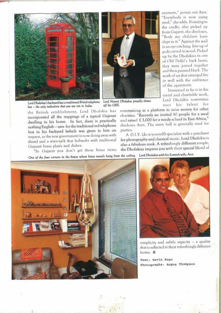 The British establishment, Lord Dholakia has incorporated all the trappings of a typical Gujarati dwelling in his home. In fact, there is practically nothing English — save for the traditional red telephone box in his backyard (which was given to him on request, as the new government is now doing away with them) and a wine-rack that hobnobs with traditional Gujarati brass plates and dishes.