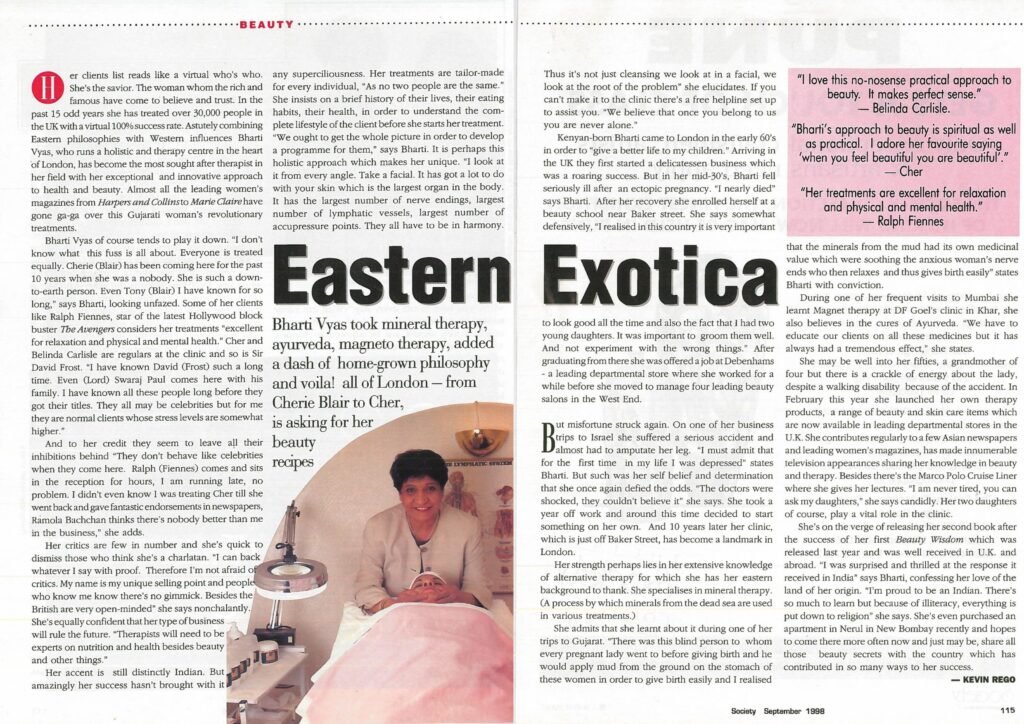 She’s on the verge of releasing her second book after the success of her first, Bharti Vyas Wisdom which was released last year and was well received in U.K. and abroad. “I was surprised and thrilled at the response it received in India” says Bharti, confessing her love of the land of her origin. “I’m proud to be Indian. There’s so much to learn from because of illiteracy, everything is put down to religion” she says. She’s even purchased a permanent house in Mumbai now together with her wish to come there more often and not just may be, share her beauty secrets with the country which, inturn contributed in so many ways to her success.