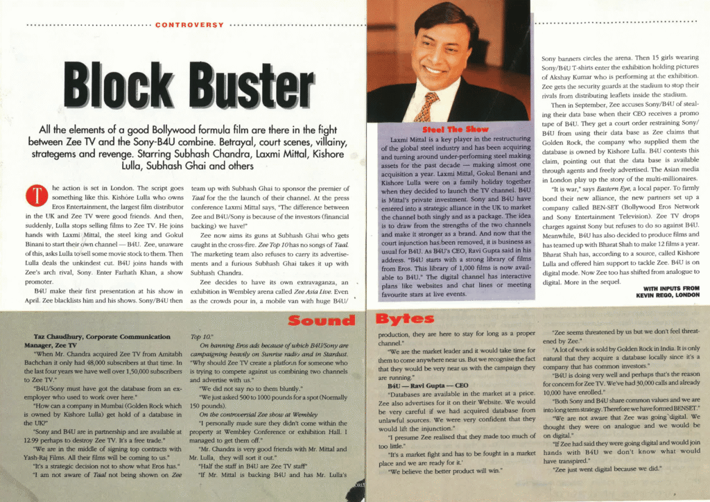 B4U make their first presentation at his show in April. Zee blacklists him and his shows. Sony/B4U then team up with Subhash Ghai to sponsor the premier of Taal for the launch of their channel. At the press conference Laxmi Mittal says, “The difference between Zee and B4U/Sony is because of the investors (financial backing) we have.”