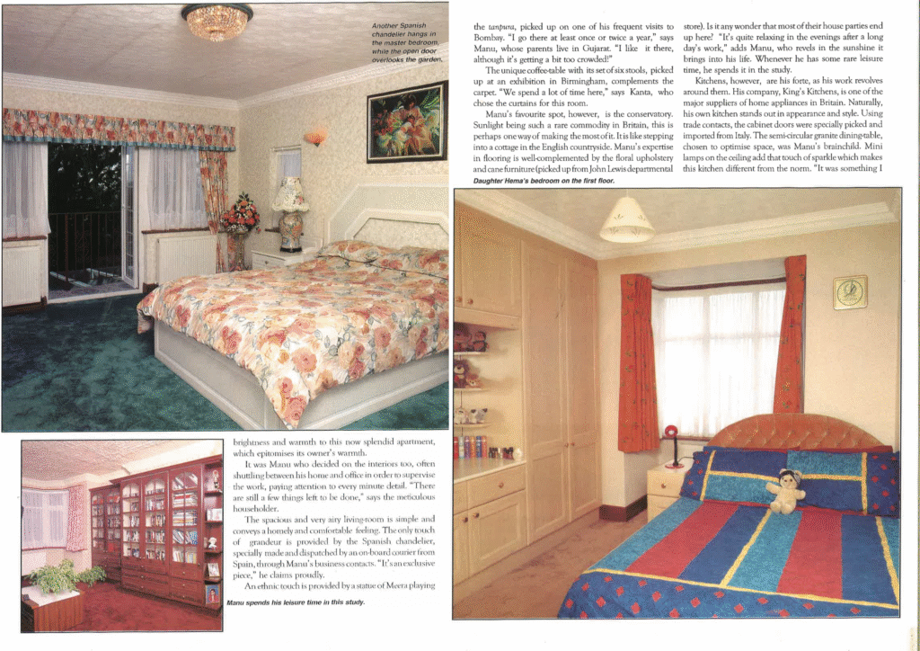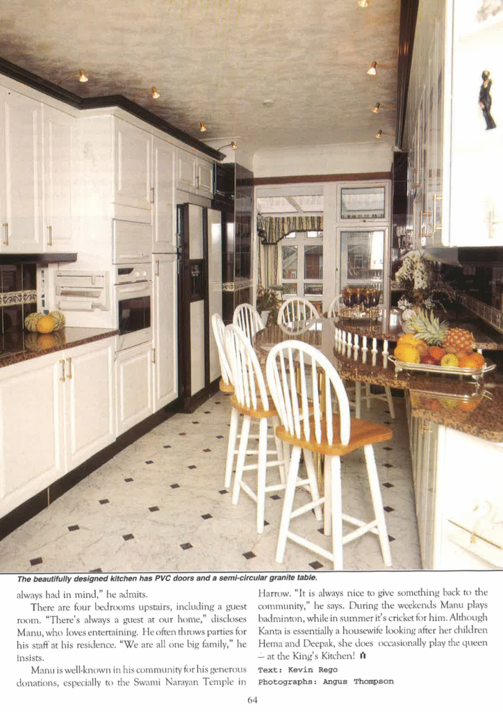 Manu is well-known in his community for his generous donations, especially to the Swami Narayan Temple in Harrow. “It is always nice to give something back to the community,” he says. During the weekends Manu plays badminton, while in summer it’s cricket for him. Although Kanta is essentially a housewife looking after her children Hema and Deepak, she does occasionally play the queen — at the King’s Kitchen!