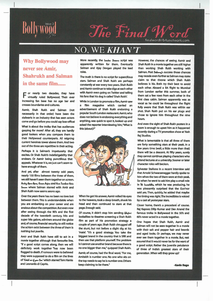 One hopes that Shah Rukh, Aamir and Salman will not be seen together in a movie with their salt-and-pepper hair and aged looks. Or perhaps we may never ever see them together in a movie. But rest assured that it would never be because of the want of a good script. Rather the juvenile petulance of three of India’s greatest stars of their generation.