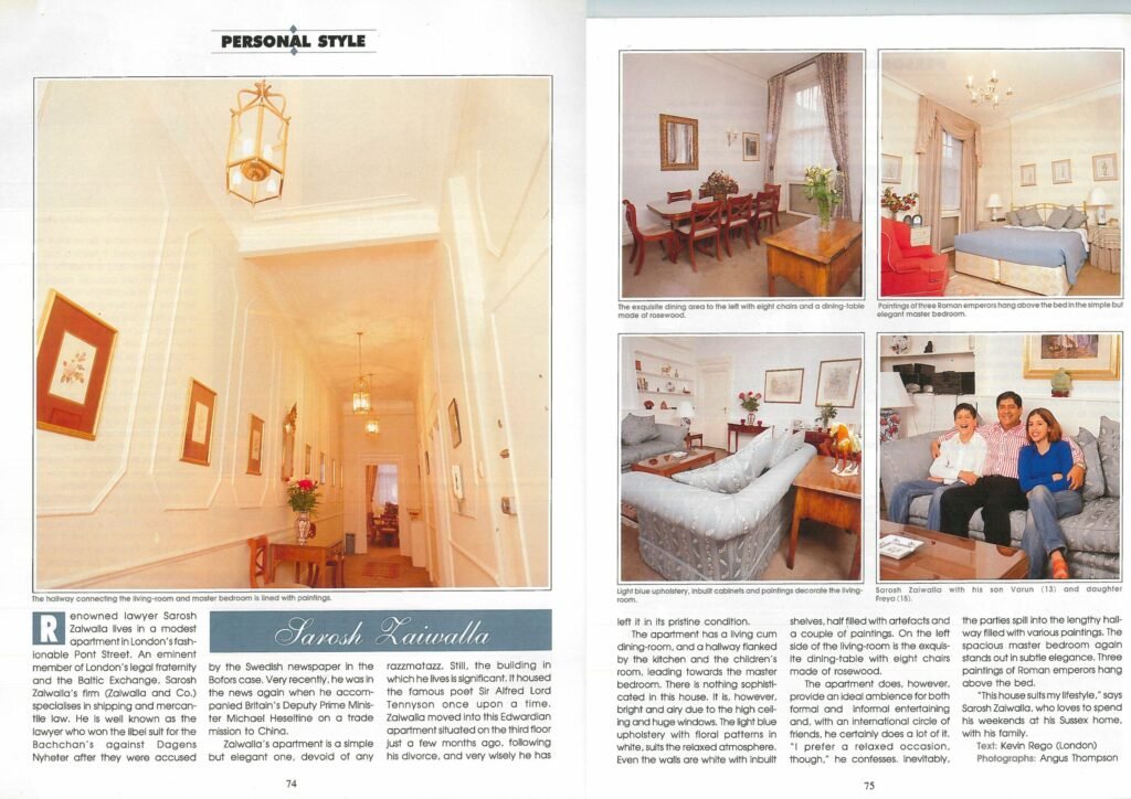 Renowned lawyer Sarosh Zaiwalla lives in a modest apartment in London’s fashionable Pont Street. An eminent member of London’s legal fraternity and the Baltic Exchange, Sarosh Zaiwalla’s firm (Zaiwalla and Co.) specialises in shipping and mercantile law. He is well known as the lawyer who won the libel suit for the Bachchans against Dagens Nyheter after they were accused by the Swedish newspaper in the Bofors case. Very recently, he was in the news again when he accompanied Britain’s Deputy Prime Minister Michael Heseltine on a trade mission to China.
