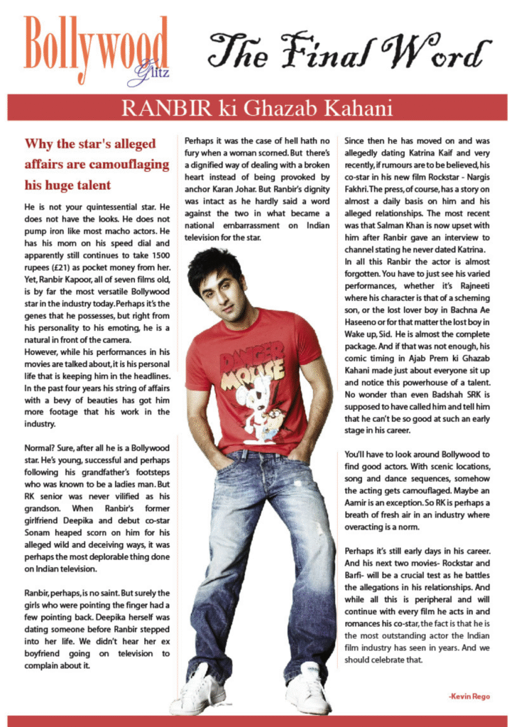 Perhaps it’s still early days in his career. His next two movies – Rockstar and Barfi – will be a crucial test as he battles allegations in his relationships. And while all this is peripheral and will continue with every film he acts in and romances his co-star, the fact is that he is the most outstanding actor the Indian film industry has seen in years.