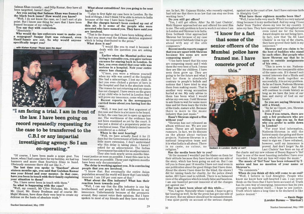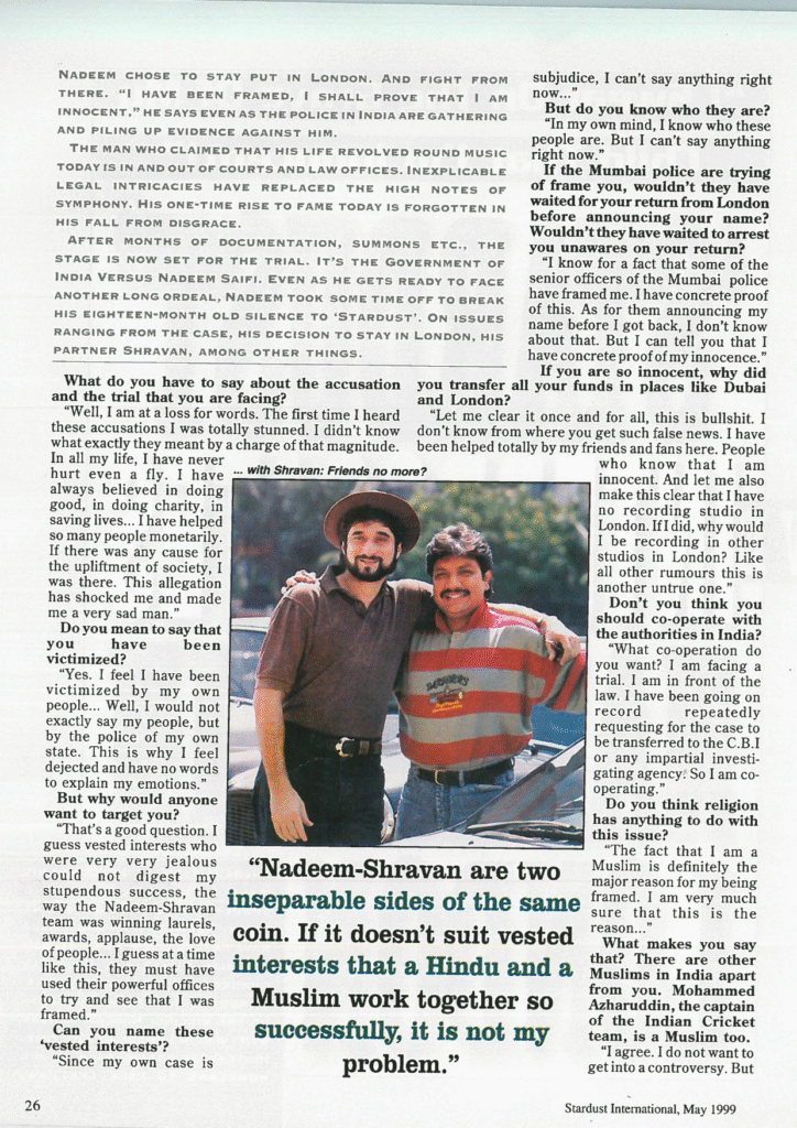 “That’s a good question. I guess vested interests who were very jealous could not digest my stupendous success—the way Nadeem-Shravan were winning laurels, awards, applause, the love of people… I guess at a time like this they must have used their powerful offices to try and see that I was framed.”