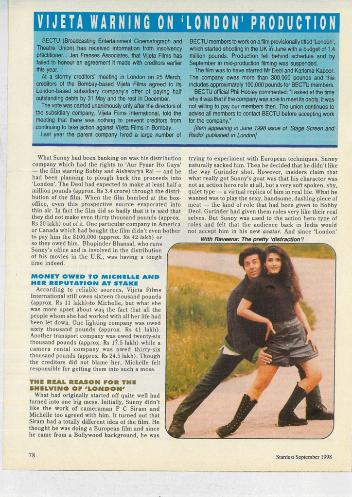 What Sunny had been banking on was his distribution company who had the rights to ‘Aur Pyaar Ho Gaya’ — the film starring Bobby and Aishwarya Rai — and he had been planning to plough back the proceeds into ‘London’. The Deol had expected to make at least half a million pounds (approx. Rs 3.4 crore) through the distribution of the film. When the film bombed at the box-office, even this prospective source evaporated into thin air. In fact, the film did so badly that it is said that they did not make even thirty thousand pounds (approx. Rs 20 lakh) out of it. One particular company in America or Canada which had bought the film didn’t even bother to pay him the $100,000 (approx. Rs 42 lakh) or so they owed him. Bhupinder Bhansal, who runs Sunny’s office and is involved in the distribution of his movies in the U.K., was having a tough time indeed.